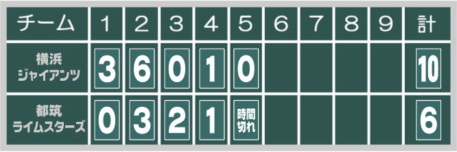 先週の“お仕置きコーシー”から“ハナタカコーシー”にシフトチェンジした投球に「☆星のコーシ様☆」と自画自賛。勘違いにもほどがあるぜ。初回いつもの「タッチアップできない病」でリズムがつくれない。今回は“ユーゴピア”が演じてみせた。さすがに子羊たちも察したか、生きるために必死をこいた。二回裏、連続四球を足掛かりに“ニッティー”、“ハヤブサ”が連打。さらに一死一塁で“ヒーローや!”のランニング弾など打者二巡超えで17得点。あいにくの小雨が降り続く中だったが集中力を切らさなかったのが勝因だろう。地区リーグ後半戦、なにがあるか分からない。神に祈ろう。