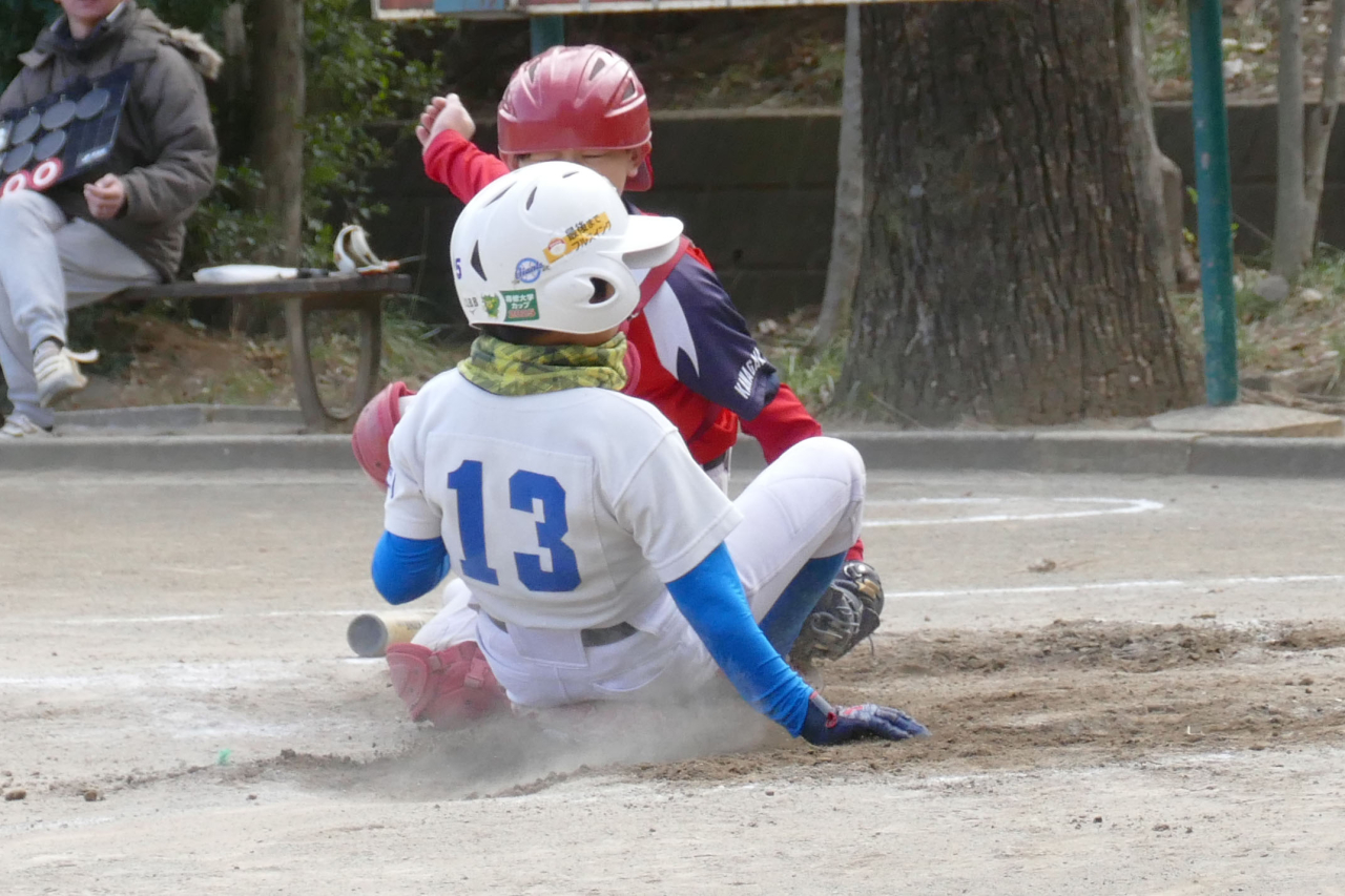 6年生最後の大会の1回戦は“ユーゴピア”午後合流ということで、しっかり勝ちに行こうとスタート。初回先頭を三振に切って取る“ダイキンマン”。その後四球・二盗、三振で二死二塁。ここで4番の適時打で先制点を与える。その裏“SHOW-TIME”初球死球、これが功を奏し二盗、暴投からの一気生還で同点。これで流れが来たかと思われたが、双方二回、三回凡打の山で次の1点取った方がかなり有利な展開に。そして迎えた四回裏、一死から“ダイキンマン”死球、捕逸で二進、“パナ”三振も“ニッティ”が7球粘ってからの左前打で“ダイキンマン”息を切らして生還。これが勝負の分かれ目のはずだったが最終回に異変が。五回二死からマウンドに上がった“バクバクコーシー”は先頭を出すと4番も敬遠で一死一二塁。ここでおあつらえの二ゴロに打ち取るが“ニッティ”が手につかない。一死満塁で張り詰めた空気の中、次打者三振で「ツーアウト!」。三塁側応援団の緊張もマックス状態だ。クリスマスには身バレするという小競り合い系異端コンビ“なによ・なにさ”も「凶器」を手に熱血応援、ざーます隊長ASA-KONGも声がだみ声に。そしてカウント2-2と追い込んだ5球目、三塁側への当たり損ねとなる。これを投三ともに一瞬躊躇し、“お手玉コーシー”が慌てて駆け下りるが間に合わない。同点やむなしだったが、間に合わない一塁へ悪送球のおまけをつけちゃいました。これで二走も生還で一転追いかける展開に。こうなると本来の子羊モードに急降下。あっけなく引っ掛け倒し三者凡退で今季終戦と相成りました。