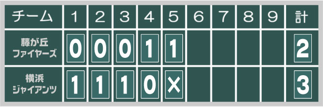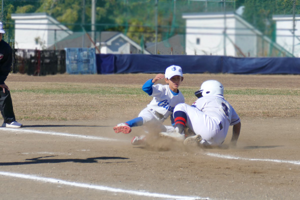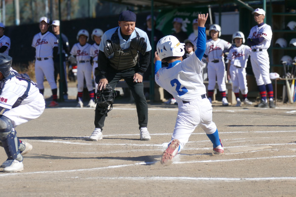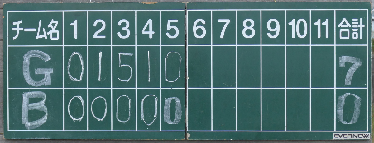 それよりも練習上がりに行われたBチームとのエールの交換でフライング泣きのざーます隊員が出現。おかげで“ド緊張コーシー”のアク抜きになったのが良かった。試合は二回表“お調子コーシー”の安打から“パナ”が送り暴投絡みで先制。三回には“一死からユーゴピア”の二塁打から“SHOW-TIME”の右前打、“クリームソータ”の二塁打、この後敵失などで5点追加だ。投げても“エッヘン コーシー”絶好調。四回をノーヒットに抑える内容。最後は“ユーゴピア”が締め優勝。3連覇を達成した。これで春季大会に向かってより一層の練習をこなし4連覇へのプレッシャーと戦うこととなった。